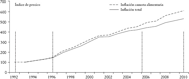 La Gráfica 6 normaliza los índices al valor observado en 1992, y muestra que para el periodo 1992-1996 en el que la pobreza se incrementó de manera considerable, los precios de los alimentos que componen la canasta básica crecieron a un ritmo muy similar al del índice nacional de precios al consumidor que integra a todos los bienes de consumo. Sin embargo, precisamente a partir de 1996 se empieza a identificar una tendencia divergente, con mayores crecimientos para los bienes incluidos en la canasta básica. Entre 1996 y 2006 la brecha entre ambos índices permanece casi constante, pero a partir de 2006 se incrementa mucho y continua hasta 2010. Esta tendencia coincide con las pautas internacionales descritos en la sección anterior de este artículo.