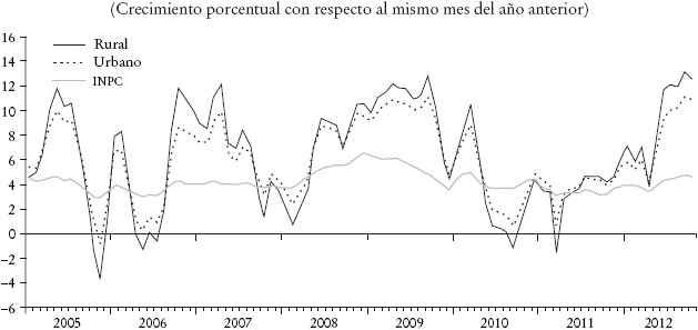La Gráfica 7 muestra la evolución pormenorizada de los precios en zonas urbanas y rurales de los bienes incluidos en la cuantificación de la canasta alimentaria que se utiliza para medir la pobreza alimentaria. Dichos índices, elaborados por Coneval presentan una pauta muy similar a la observada para 2007-2012 en los mercados internacionales (véase Gráficas 1 y 2) pero también revela que los periodos de creciente inflación en los bienes de la canasta alimentaria de México se observan desde 2005. Específicamente, en los meses de marzo a abril de ese año, la inflación para la canasta alimentaria rural y urbana fue casi 12% mayor que la inflación general. Una pauta similar se observa entre septiembre del 2006 y julio del 2007, con inflaciones también superiores en alrededor de 12 por ciento.