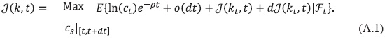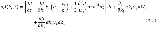 Para encontrar la ecuación (9) se necesita sustituir 𝒥(kt, t) = V(kt)e-ρt y aplicar (A.2) a la ecuación (A.1), posteriormente tomar esperanzas y fijar E(dz) = 0, dividir entre dt y tomar el límite cuando t → 0 , con lo que se obtiene lo siguiente:
