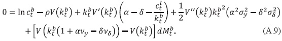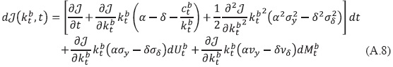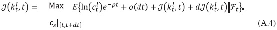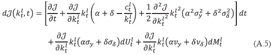 Para encontrar la ecuación (34) se necesita sustituir 𝒥(klt, t) = V(klt)e-ρt y aplicar (A.5) a la ecuación (A.4), posteriormente tomar esperanzas y fijar E(dMt) = 0, dividir entre dt y tomar el límite cuando t → 0, con lo que se obtiene lo siguiente: