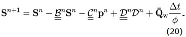 The row vector of the last relation is, indeed, a row of a matrix N × N, in which every row has a corresponding relation of some element of the -size mesh. The N-size column vector contains the saturation in the elements of the mesh at time n. Defining matrices and for the terms related to cn and dn respectively in the equation (11), we get a final linear algebra version of the saturation equation