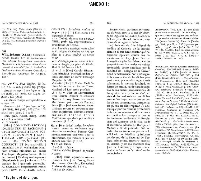 Este libro ha sido registrado con la metodología propuesta por la tipobibliografía española y corresponde al número 68875 del catálogo. Como se observa indica una obra de Johann Wild, impresa en Alcalá de Henares por Andreas de Angulo en 1567. El registro es completamente detallado, como es característica metodológica de la bibliografía material. Es interesante anotar que incluso se registran los preliminares de acuerdo con la signatura tipográfica correspondiente. También se hacen anotaciones sobre otros ejemplares que se han revisado y en relación a éstos se establecen las erratas. Tal consideración corresponde a la idea de la "copia ideal", concepto introducido por las aportaciones anglosajonas.