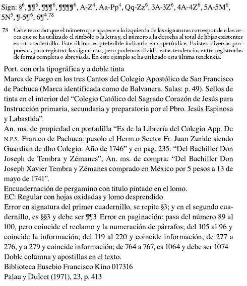 Lamentablemente no contamos con mayores datos para comparar esta representación bibliográfica con la primera presentada, porque el trabajo metodológico del INAH no incluye nada relacionado con las signaturas, los preliminares, la estructura del texto impreso o los repertorios donde el mismo libro ha sido ya registrado. Toda esta información sí está disponible en el registro español, aunque no lo que corresponde al valor histórico de la obra descrita y que sí se incluyó en el registro del INAH.