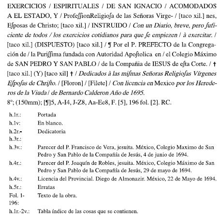 Exercicios espirituales de San Ignacio acomodados a el estado y profesión religiosa de las señoras vírgenes, esposas de Cristo... Con licencia en México: por los Herederos de la Viuda de Bernardo Calderón, 1695.