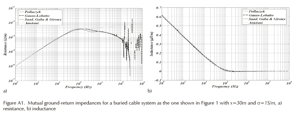 Figure A1 shows mutual ZG(ω) calculated with Pollaczek algorithm (Uribe et al., 2004), Gauss/Lobatto quadrature routine (Gander and Gautschi, 2000), Ametani method (Dommel, 1986) and complex depth formula (Saad, Gaba and Giroux, 1996) for the buried cable system shown in Figure 1, with x = 30 m and σ = 1 S/m.