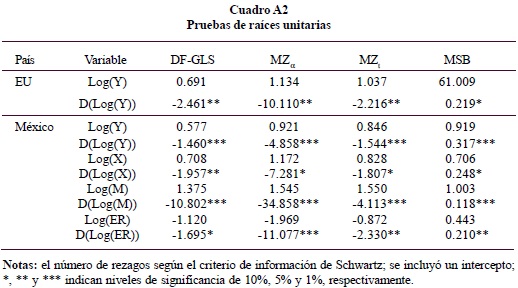 El estado actual de la literatura alerta sobre la distorsión derivada del tamaño muestral y el reducido poder de las pruebas Dickey-Fuller aumentada y Phillips-Perron (Maddala y Kim, 2002, capítulo 4). En ese sentido, aplicamos sus correcciones, las pruebas df-gls de Elliott, Rothenberg y Stock (1996), y Perron-Ng (1996) y Ng-Perron (2001). El Cuadro A2 indica que el orden de integración del producto interno bruto de Estados Unidos y México, de las exportaciones e importaciones y del tipo de cambio real es uno lo cual desde un punto de vista mcroeconómico, y a excepción del tipo de cambio real, tiene completo sentido.