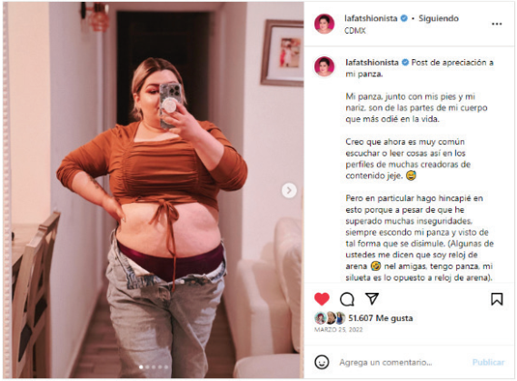 En una publicación, @lafatshionista (Arias, 2022b) reconoce que su panza, sustantivo coloquial que utiliza para referirse a la parte abultada de su vientre, es la parte de su cuerpo que más ha odiado por años. Resalta que, si bien ha ido superando sus inseguridades, la esconde y viste de tal forma que logra disimularla.