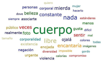 Como se aprecia en la Figura 1, la palabra identificada con mayor frecuencia es panza, repetida ocho veces y, a su par, la palabra cuerpo. También se identifica la palabra mujeres con siete menciones y, en quinto lugar, con una frecuencia de seis veces, la palabra vida. Si bien son las expresiones que más resaltan en la figura, hay otras que también forman parte de los significados del cuerpo, como feminismo, fotos, todas, personas, modelos, salud, años, muchas, entre otras.