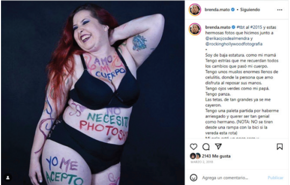 En la publicación de @brenda.mato realizada el 2 de marzo de 2018, se aprecia que ejerce un activismo desde el autorreconocimiento de su cuerpo como una forma de representación de ella y de su cotidianidad.