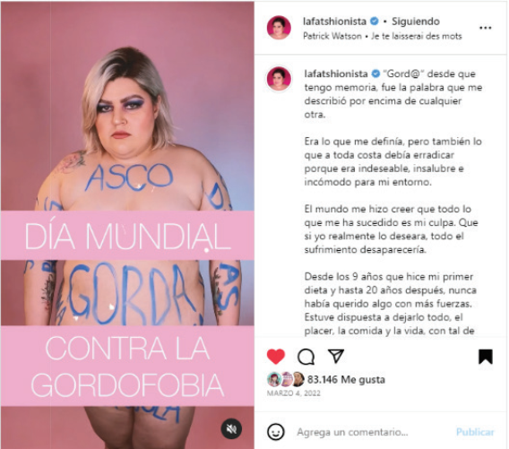 Por otro lado, está el 4 de marzo, Día Mundial contra la Gordofobia. En este día, se identificó a @lafatshionista con un discurso distinto en las redes sociales, mientras cuenta su historia con la gordofobia: “Si buscamos realmente la salud, lo que hay que combatir, es la gordofobia” (Arias, 2022a). Así, compartió una secuencia de imágenes que reflejaban visualmente su discurso. En la publicación se observa a @ lafatshionista parada de frente, completamente desnuda y la palabra asco escrita con pintura en la parte de su pecho y gorda en su estómago, ambas con color azul, además, el escrito “4 de Marzo Día Mundial Contra la Gordofobia” con una tipografía que cubre el pecho y parte de la cadera.