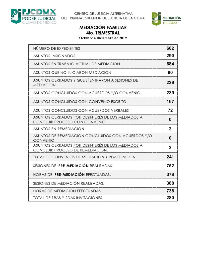 Actualmente el Centro de Justicia Alternativa del Tribunal Superior de Justicia de la Ciudad de México ofrece y otorga el servicio de mediación familiar, demostrando que el proceso es efectivo para resolver controversias relacionadas con la familia, debido a que solamente en el último trimestre de 2019, logró tener el 82.4% de efectividad en asuntos concluidos con acuerdos o convenios (Poder Judicial CDMX, 2019).