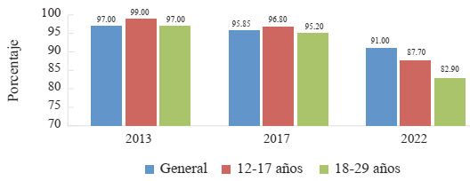 Comprender las dinámicas de consumo mediático ligadas a escenarios marcados por los procesos de convergencia -esto es, de las transformaciones en las prácticas de consumo ligadas al proceso de digitalización por el cual los servicios de comunicación audiovisual que tradicionalmente se ofrecían en soportes analógicos comienzan a estar disponibles en plataformas digitales- trae nuevas complejidades a la hora de ser abordados empíricamente. Este proceso de transformación de las prácticas de consumo está atravesado, en primer lugar, por el uso de Internet. Como podemos observar en la Figura 7, existe un incremento sostenido que en 2022 alcanza al 91.8 % de la población. En diez años, el uso de Internet sube un 30 %. Es destacable que el acceso a Internet entre los grupos etarios jóvenes es más alto y casi universal.