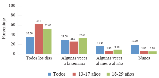 En la Figura 2 observamos qué géneros son consumidos en televisión. En primer lugar, podemos reconocer que el uso predominante de la televisión es informativo, un género que consume el 70 % de la población. Sin embargo, en el grupo que tiene entre 13 y 17 años ese uso disminuye al 46.1 %, y en el grupo que tiene entre 18 y 29 años disminuye al 62.9 %.