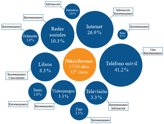 Los periódicos y la radio tienen poca importancia, y las revistas no se incluyeron en el repertorio mediático de los alumnos de duodécimo curso. La radio solo se asocia con el entretenimiento y la información para los alumnos de sexto curso, ya que para los de noveno y duodécimo es una fuente de entretenimiento. Los ordenadores alcanzan su mínima expresión entre el grupo de mayor edad y se caracterizan como otra fuente de entretenimiento, mientras que la información o el conocimiento no se citan. La información está vinculada a Internet. A su vez, el teléfono móvil tiene la mayor presencia entre los alumnos de duodécimo curso en comparación con los demás años de escolarización. Al igual que el grupo de 14 a 15 años (noveno curso), los alumnos de duodécimo curso asocian los teléfonos móviles con la información y la comunicación.