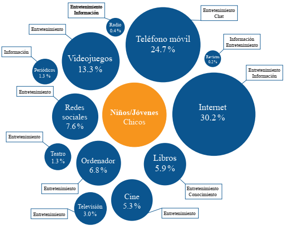 Internet es el segundo medio más mencionado por las chicas como parte de su repertorio y engloba las distintas formas de acceder al ciberespacio, mientras que para los chicos, Internet aparece como el principal medio preferido.