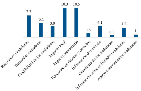 Finalmente, en el rol cívico (Figura 4) destacan los indicadores que se relacionan con una dimensión más defensora (advocate) en la que predominan las noticias que incluyen reacciones y demandas ciudadanas, mientras la publicación de cuestiones planteadas por la ciudadanía y el apoyo a los movimientos sociales son las características menos presentes. Cuando consideramos una dimensión más educativa del rol cívico, destaca la inclusión en las noticias que abordan el impacto local y comunitario de las decisiones políticas. La información sobre derechos y deberes de los ciudadanos representa menos del 2 % de las noticias.