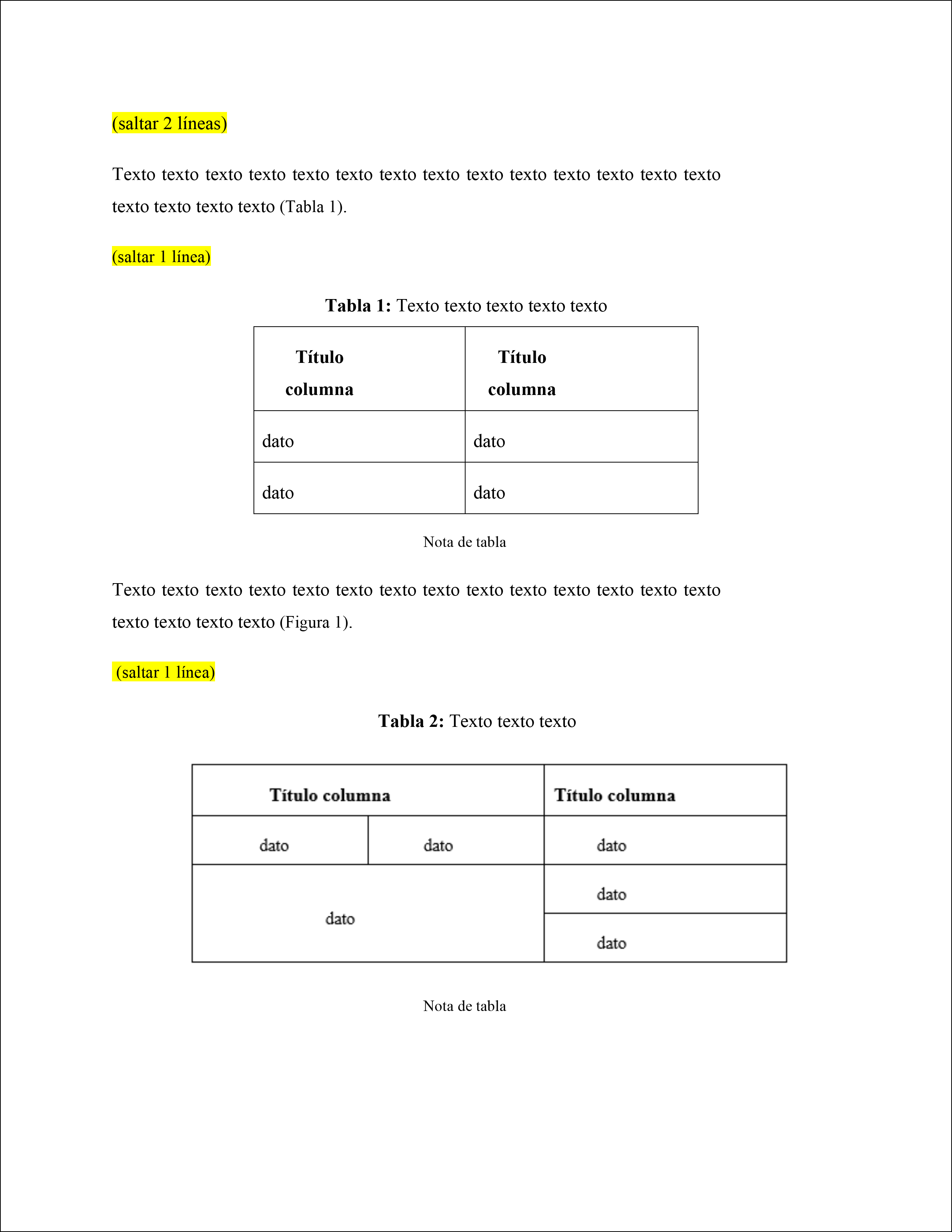 | Títulos de sección | 16 puntos | Centrado | Negritas | Dos líneas en blanco antes del Título de sección y otras dos después | |