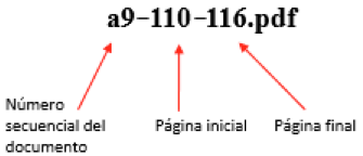 Cada uno de los documentos del número (artículos, editoriales, reseñas, etc.) de la revista se constituirá en un archivo Word; el nombre de cada archivo Word se forma con un número secuencial de archivo y las páginas inicial y final que le corresponden en el archivo PDF.