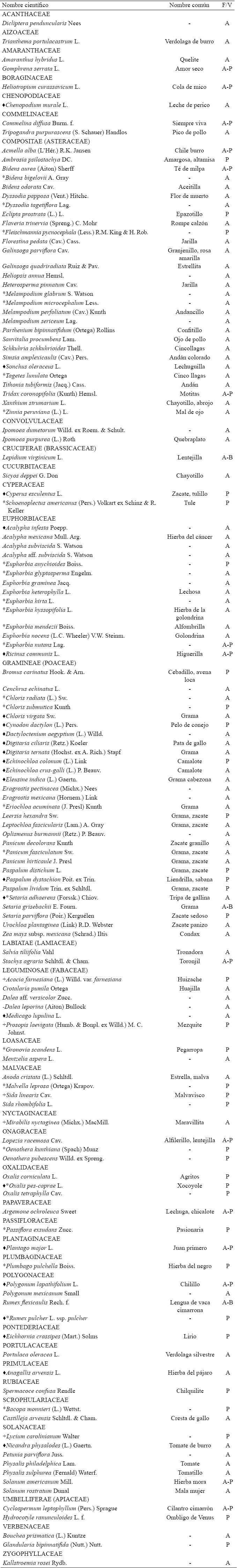 Lista de las especies arvenses en cultivos de maíz de temporal en suelos salinos de la ribera del Lago de Cuitzeo, Michoacán, México. F/V: Forma de vida, A: Anual, P: Perenne, A/P: Anual-Perenne, A/B: Anual-Bianual; (+) Especies leñosas; (♦) Especies introducidas; (*) Nuevos registros.