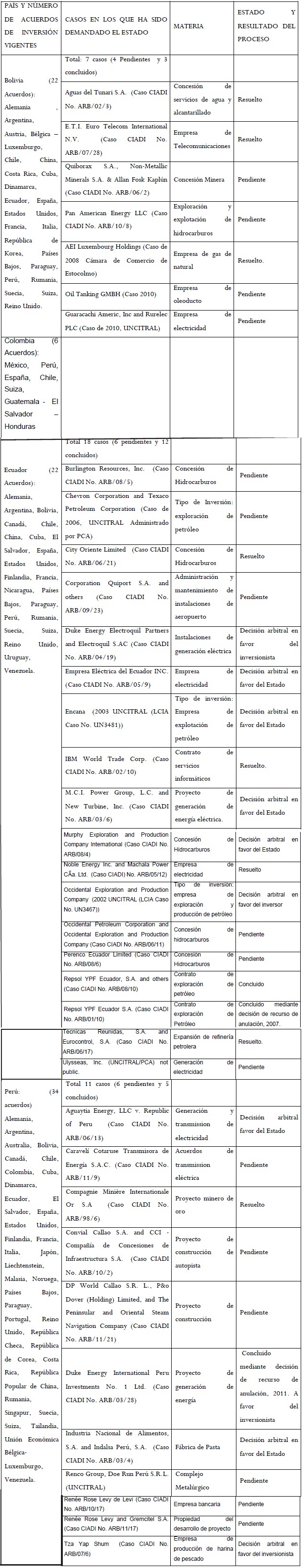Fuente: Para los casos: Base de datos de CIADI y UNCTAD y para Renco Group, Doe Run Perú S.R.L.: Expreso, "Perú enfrenta juicios ante el CIADI por 4.500 millones" 03/10/11. Para los acuerdos vigentes: Base de datos de UNCTAD, CIADI, SICE-OEA, CORPEI Ecuador, Agencia de Promoción de Inversión Privada Perú y Ministerio de Comercio, Industria y Turismo de la República de Colombia.