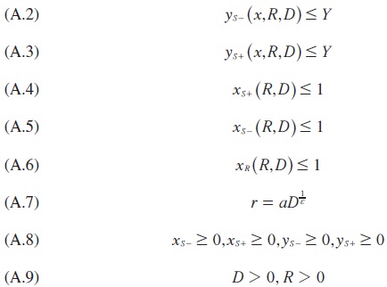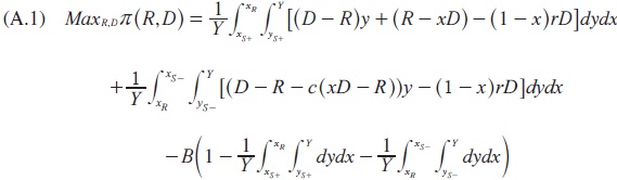 Equation (A.1) is the simplified banking objective function (10) under the assumption that f(x) and g(y) are uniform density functions (Laplace criterion to deal with uncertainties in both sides of the balance sheet). Inequalities (A.2) and (A.3) define the inter-temporal liquidity-solvency relationship and its constraints. Inequalities (a.4) and (A.5) define the viability condition of the asset transformation process. Inequality (A.6) shows the reserves/deposit ratio. Equation (A.7) describes the constant-elasticity supply of deposits. Inequalities in (A.8) define the minimum threshold values for x and y. Inequalities in (A.9) are the non negativity constraints.