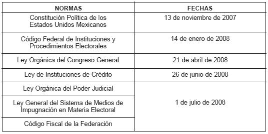 La reforma electoral de 2007 es un paquete de soluciones legales, así que a continuación se mencionarán las normas modificadas y sus fechas de anuncio en el Diario Oficial de la Federación: