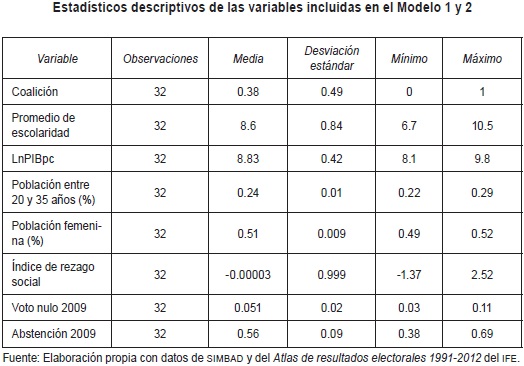 Para la construcción del modelo de regresión lineal, las variables independientes utilizadas: Promedio de escolaridad, Producto Interno Bruto Per Capita, Población entre 20 y 35 años, Población femenina, fueron retomadas de INEGI 2010; el Índice de Rezago Social se retomó de CONEVAL, y el Voto nulo 2009 y la Abstención 2009 fueron obtenidas del Atlas de Resultados Electorales del IFE 1991-2012. La variable Coalición fue dicotómica, donde 0 significó estados con distritos Con Coalición y 1 entidades con distritos Sin Coalición. Para la construcción de la variable dependiente se utilizó el porcentaje de Voto nulo obtenido de la elección de Diputados Federales de 2012.