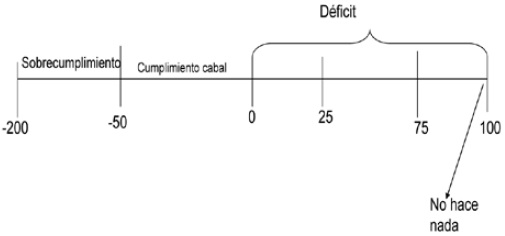 Este indicador de desempeño debe ser interpretado tanto por sus valores extremos como por sus intervalos, en virtud de que los valores de las respuestas de la tabla anterior no son equivalentes, aunque todos se inscriben en una misma escala. Por ejemplo mucho tiene un valor mayor en la primera pregunta, mientras que poco, tiene un valor inferior. Estas discrepancias nos sugieren medidas en ciertos rangos, más que valores puntuales. La escala es la siguiente: