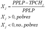 Donde PPLP es el promedio ponderado de las líneas de pobreza urbana y rural; α, la proporción rural de la población total; LPiR, la línea de pobreza rural para la pobreza del tipo i (alimentaria, capacidades o patrimonial);6 LPiU, línea de pobreza urbana; YPCH, el ingreso per cápita del hogar donde vive el j-ésimo encuestado. X es la brecha de la pobreza que mide la relativa entre PPLP y los ingresos del encuestado j-ésimo. Si esta brecha es positiva, éste puede ser considerado como pobre; si es negativa o igual a cero, como no pobre.