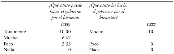 La estimación de este déficit fue realizada en tres etapas: en la primera se pregunta al encuestado qué tan importantes son varias dimensiones del bienestar: economía, salud, armonía familiar, armonía social, educación, futuro de los hijos y libertad para realizar un proyecto de vida. Las respuestas opcionales son totalmente, mucho, poco, y, obviamente, nada. Como era de esperarse, las respuestas se concentran en las dos primeras (72%). A continuación se esgrimen dos cuestionamientos: "¿Qué tanto puede hacer el gobierno para mejorar esas dimensiones?" y "¿qué tanto ha hecho el gobierno para mejorarlas?". La primera da cuenta de la capacidad del gobierno, y la segunda, de la forma en que utiliza esa capacidad en su ejercicio. Ello da lugar a una valorización de las siguientes respuestas: