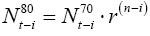 Los valores para cualquier año t en la nueva base (1980), partiendo de los niveles de la base anterior (1970) se calcularon como: