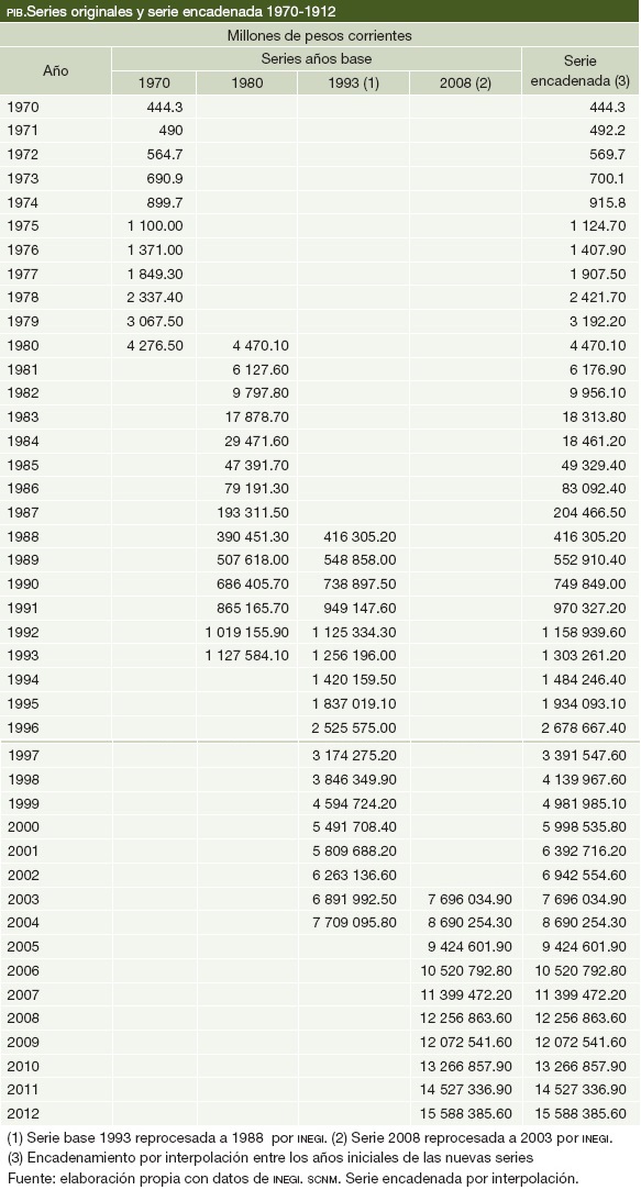 Las series utilizadas tienen como base los años 1970, 1980, 1993 y 2008. No se usó la serie basada en el año 2003 porque al cambiarse la base a 2008, el INEGI hizo un reprocesamiento con la información anterior desde el año 2003 a la nueva base 2008.