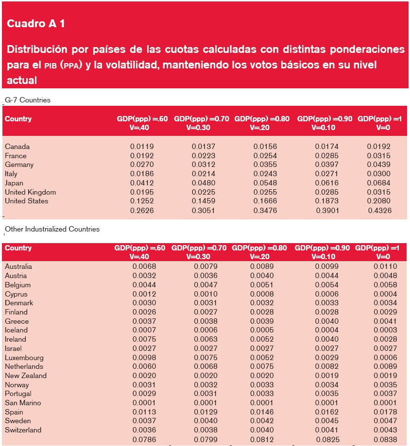 El comunicado de los ministros del G-24 del 1 de octubre de 2004 señala que debería simplificarse la fórmula para el cálculo de las cuotas a fin de dar mayor peso al producto interno bruto medido en función de la paridad del poder adquisitivo y de tomar en cuenta la vulnerabilidad de los países en desarrollo ante las variaciones de los precios de los productos básicos, la volatilidad de los flujos de capital y otros shocks exógenos. Hemos realizado algunas simulaciones numéricas que nos permiten visualizar los resultados que tendría este enfoque.