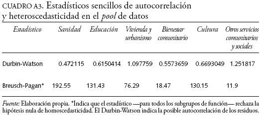 El cuadro A2 muestra los resultados del estudio de la autocorrelación y la heteroscedasticidad en el pool de datos. Estos resultados indican que existe cierto nivel de autocorrelación en los residuos analizando el estadístico de Durbin-Watson, así como heteroscedasticidad usando el contraste de Breush-Pagan. En este sentido, y en vista de estos resultados, las estimaciones que se han llevado a cabo en el presente trabajo han tenido en cuenta estas dos cuestiones. Así, el modelo dinámico planteado para estudiar las hipótesis de incrementalismo y utilidad de la información en el contexto de los datos de panel ha considerado ambos problemas estimando de forma robusta ante la existencia de autocorrelación y heteroscedasticidad los errores estándar de los coeficientes.