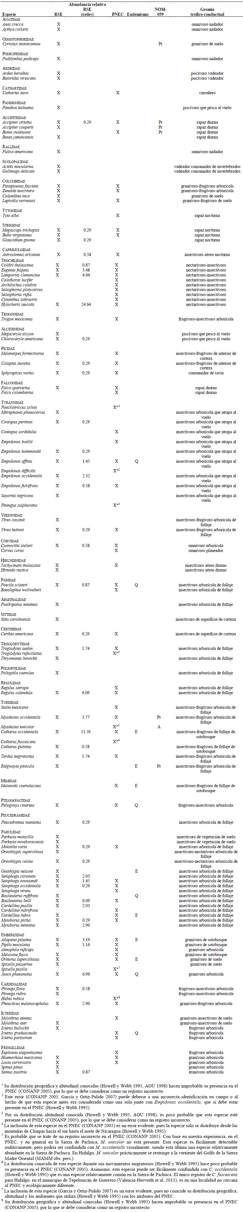 Especies de aves registradas en el Rancho Santa Elena (RSE) y las reportadas en el Parque Nacional El Chico (PNEC; Gallina et al. 1974, CONANP 2005, García y Ortiz-Pulido 2007, Ortiz-Pulido et al. 2008, aVerAves 2012). La abundancia relativa en el RSE está expresada como el porcentaje de individuos capturados de la especie en relación con el total de capturas. Se especifica su nivel de endemismo (sensu González-García y Gómez de Silva 2003) en endémicas (E) y cuasiendémicas (Q), y su categoría dentro de la NOM-059-SEMARNAT-2010 (SEMARNAT 2010) como sujeta a protección especial (Pr) o amenazada (A). Las especies con asterisco (*) son registros incorrectos o probablemente incorrectos.