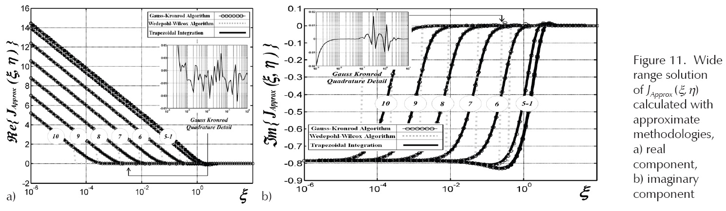 The wide range approximate solutions of Pollaczek’s integral calculated via the Wedepohl-Wilcox algorithm, trapezoidal integration, and Gauss-Kronrod algorithm, are depicted in Figure 11. There are some numerical oscillations, that are more noticeable in the real component case of the η10 curve (its value is tabulated in Figure 5), when applying the Gauss-Kronrod algorithm in the following range 10-4 < ξ < 100.
