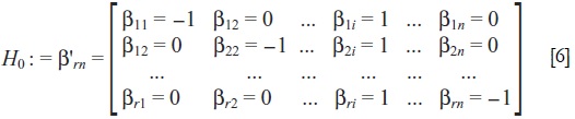 Johansen y Juselius (1992) construyeron el estadístico de la razón de verosimilitud para verificar las hipótesis impuestas sobre la matriz de coeficientes de cointegración β'rn y sobre la matriz de coeficientes de ajuste de corto plazo αnr.