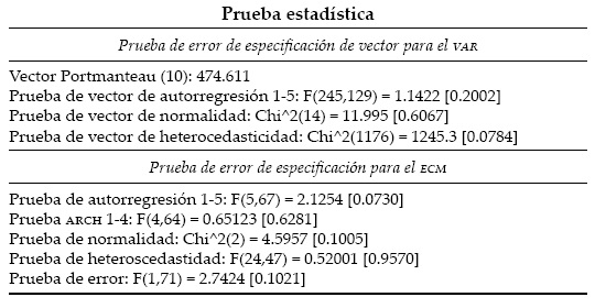 Nuestro VAR tiene siete variables ficticias, dos de ellas para 1990 (segundo y tercer trimestre), cuando GS, M2 y WS muestran un comportamiento anómalo; una para 1991 (cuatro trimestres) cuando las variables Y*, W y GS tienen un comportamiento errático; tres para 1995 (cuatro trimestres) cuando la economía mexicana sufrió una crisis profunda, y una para 1997 (cuatro trimestres) cuando las tasas de interés se desplomaron y llegó un flujo apabullante de capital externo.