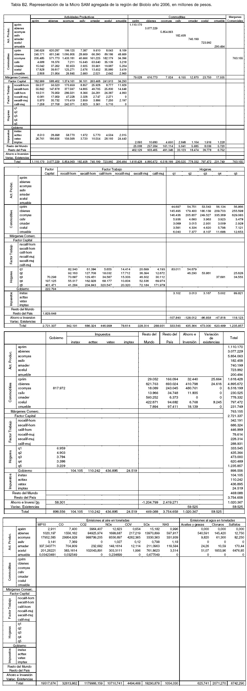 Estos porcentajes se utilizan para desagregar la SAM del año 2006 para la región del Biobío. En la SAM Regional del año 2006 de Mardones y Saavedra (2011), el sector agropecuario-silvícola compró insumos al sector agropecuario-silvícola por 44 635 millones de pesos, pero para el presente estudio se necesitó desagregar ese valor en el sector agropecuario y en el sector silvícola. A continuación se presenta este valor desagregado utilizando los porcentajes expuestos anteriormente.