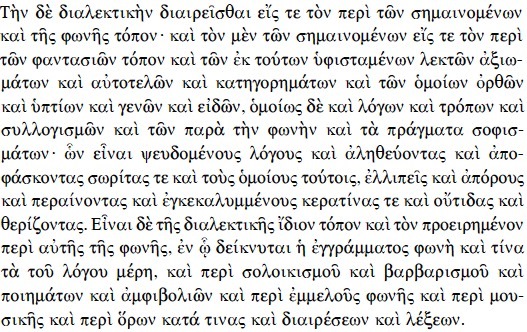 La dialéctica se divide en un área concerniente a los significados y otra al sonido vocal; y el [área] de los significados [se divide] en área de las presentaciones y de los decibles que a partir de ellas subsisten: proposiciones, [que son decibles] completos, predicados tanto activos como pasivos, géneros y especies y, de manera similar, argumentos, modos de argumento, silogismos y sofismas que dependen del sonido vocal y de los estados de cosas. Entre esos sofismas se encuentran los argumentos "del mentiroso", "del que dice la verdad", "del que niega los argumentos", "del sorites" y, los defectuosos, aporéticos y los conclusivos, que se asemejan a ellos. Los argumentos "del velo", "del cornudo", "del no-alguien" y "del segador". Corresponde también a la dialéctica el área peculiar, antes mencionada, que se refiere al sonido vocal mismo, en la cual se muestra la expresión escrita y cuáles son las partes del discurso, la cual se refiere al solecismo, al barbarismo, la poesía, la ambigüedad, la expresión melodiosa, la música, y, de acuerdo con algunos [estoicos], a las definiciones, las divisiones y las expresiones.