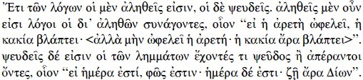 Además, de los argumentos, algunos son verdaderos, otros, falsos. Verdaderos son los argumentos que concluyen a través de [premisas] verdaderas, por ejemplo: "si la virtud beneficia, el vicio daña"; [pero por cierto la virtud beneficia; por lo tanto, el vicio daña]. Falsos son los argumentos que poseen una de sus premisas falsa o son inválidos, por ejemplo: "si es de día, hay luz; es de día; por lo tanto, Dión vive".