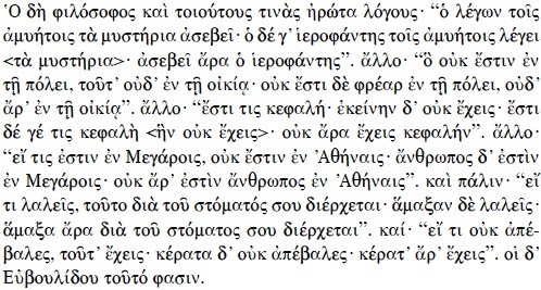 [Crisipo] el filósofo también ponía a consideración argumentos como los siguientes: "quien divulga los misterios a los no-iniciados es impío; pero el hierofante, al menos, divulga <los misterios> a los no-iniciados; por consiguiente, el hierofante es impío". Otro más: "lo que no está en la ciudad, tampoco está en la casa; no hay un pozo en la ciudad; por consiguiente, tampoco hay uno en la casa". Otro más: "existe cierta cabeza, pero no la tienes; pues bien, existe una cabeza que no tienes; por consiguiente, no tienes una cabeza". Otro más: "Si alguien está en Megara, no está en Atenas; pero un hombre está en Megara; por consiguiente, un hombre no está en Atenas". De nuevo: "si pronuncias algo, eso pasa por tu boca; pronuncias carro; por consiguiente, un carro pasa por tu boca" y "si no has perdido algo, lo tienes; no has perdido unos cuernos; por lo tanto, tienes unos cuernos". Otros dicen que éste es de Eubúlides.