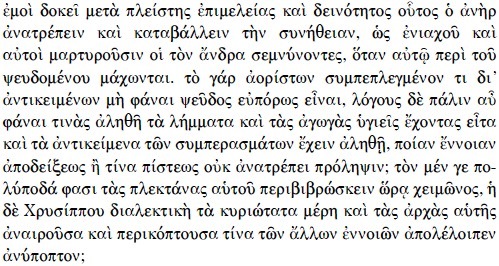 Este hombre me parece echar abajo y hundir la costumbre con gran ahínco y destreza como ocasionalmente lo testifican los que lo veneran, cada vez que se enfrentan con él respecto del "Mentiroso". En efecto, ¿a qué clase de concepción de demostración o de preconcepción de prueba no derriba el negar que es falsa sin restricción una conjunción que se obtiene por medio de [proposiciones] contradictorias indefinidas y, asimismo, afirmar que en ciertos argumentos que poseen premisas verdaderas y [llevan a cabo] una inferencia congruente, las contradictorias de sus conclusiones también son verdaderas? En todo caso, dicen que el pulpo carcome sus propios tentáculos en la época de invierno, pero la dialéctica de Crisipo, al destruir y amputarse sus principales partes y principios, ¿a cuál de las demás concepciones ha dejado fuera de sospecha?