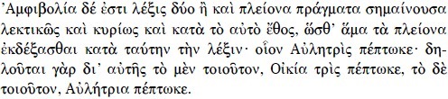 Una ambigüedad es una expresión que, lingüística y estrictamente, significa dos o incluso más estados de cosas y de acuerdo con el mismo uso, de manera que, conforme a esa expresión, se admiten simultáneamente los múltiples [significados]. Por ejemplo, auletris peptoke pues por sí misma [esta expresión en griego] revela lo siguiente: "una casa tres veces se ha caído" o "Una flautista se ha caído".