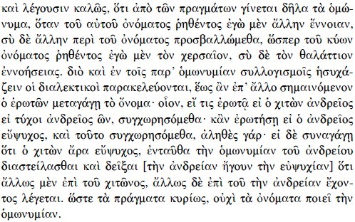 Y argumentan correctamente [al decir] que las homonimias manifiestas proceden de las cosas cada vez que, al pronunciarse el mismo nombre, proponemos, yo, una concepción y tú, otra, respecto del nombre, como cuando al haberse pronunciado el nombre "perro" yo pensé, por mi parte, en el perro terrestre, pero tú, en el perro marino. Por ello, en los silogismos que descansan sobre una homonimia, los dialécticos nos sugieren callar hasta que la persona que pregunta remita la palabra a otro referente. Por ejemplo, si alguien pregunta si "el abrigo" es masculino, concordaremos (si resultara que es masculino). Y si preguntara si "el masculino" es animoso, también concordaremos, pues es cierto. En cambio, si dedujera que, por lo tanto, "el abrigo" es animoso, en esa circunstancia recomiendan distinguir la homonimia de "masculino" y mostrar que se predica de una manera del abrigo y de otra distinta de quien tiene valentía. Por consiguiente, en sentido estricto, [son] los estados de cosas, pero no los nombres, los que producen la homonimia.