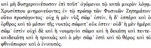 Y que ustedes no se disgusten si son conducidos por el argumento que [avanza] poco a poco hacia esos casos, acordándonos de Crisipo que en el libro I de sus Investigaciones Físicas concluye así: no es el caso que la noche sea un cuerpo, y la tarde, el alba y la medianoche no sean cuerpos; tampoco es el caso que el día sea un cuerpo, pero que no sea un cuerpo el primer día del mes, el décimo, el quinceavo, el trigésimo, el mes [entero], el verano, el otoño y el año.