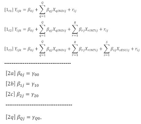 A continuación se presentan formalmente los modelos de regresión multinivel especificados en este artículo. Dado que en el nivel 3 (entidades) no se introdujeron variables, y para fines de simplicidad en la exposición, se muestra únicamente un modelo de dos niveles (individuos y escuelas).