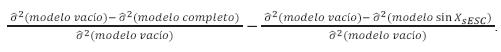 Es decir, se introdujeron los grupos de factores individuales en un orden determinado (tn), siendo el porcentaje de varianza explicado únicamente por el último grupo el que se considera como su efecto específico. El orden de introducción de los grupos se varió de tres maneras, para dejar en último lugar siempre un grupo distinto. Por ejemplo, la proporción de varianza de Y ij explicada específicamente por las variablesXsESCse calculó como la diferencia entre la proporción de varianza explicada por el modelo completo y la proporción de varianza explicada por un modelo sin dicho grupo: