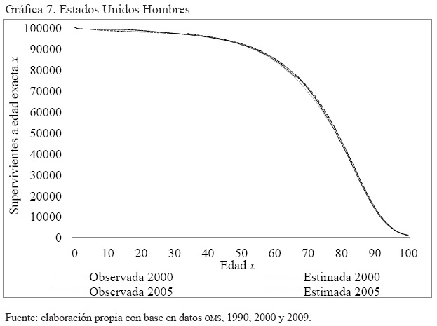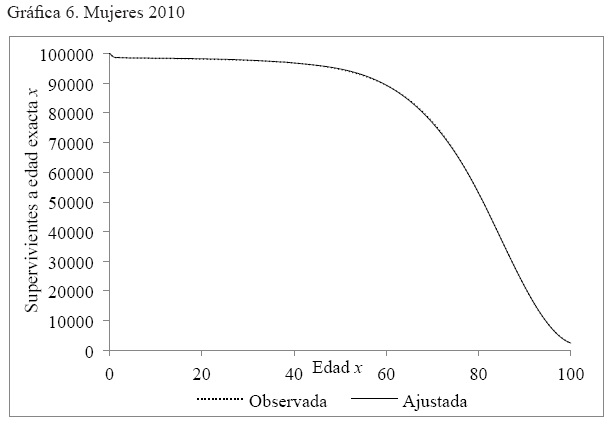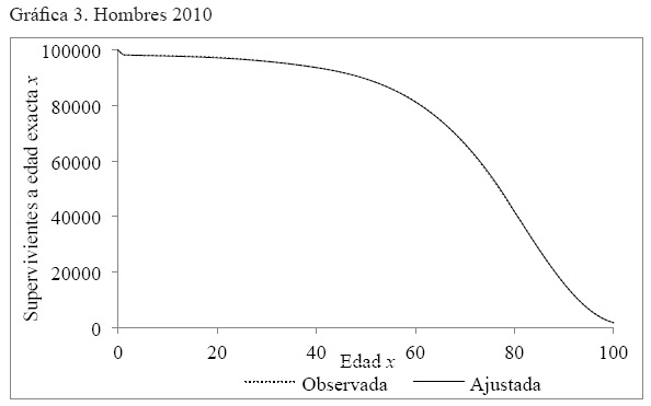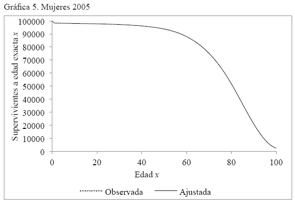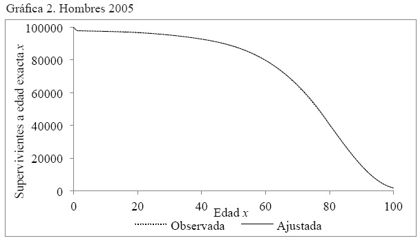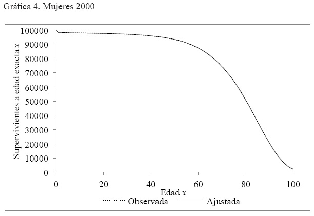 Anexo 2. Gráficas por año de la comparación de la serie de supervivientes a edad exacta x, observada y ajustada, hombres y mujeres. México 2000, 2005 y 2010