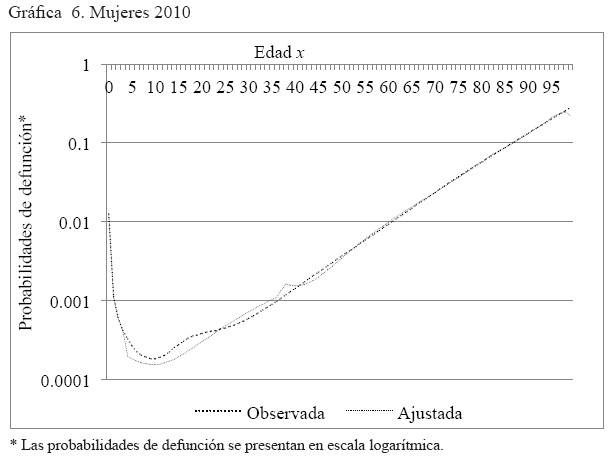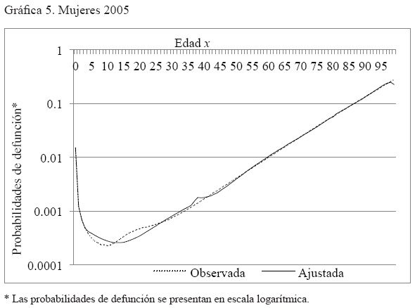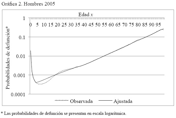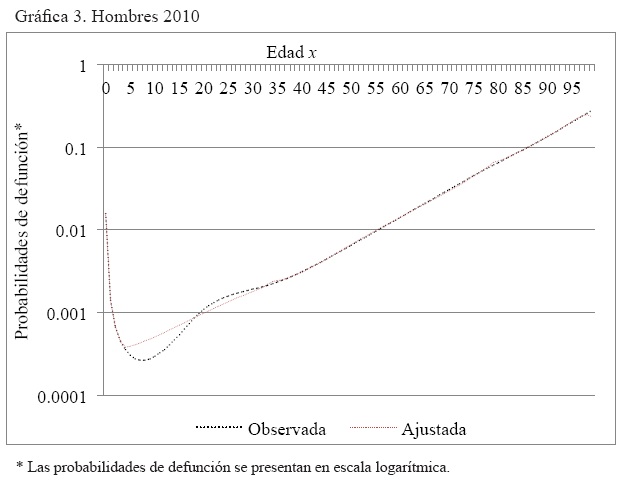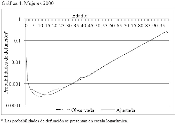 Anexo 3. Gráficas por año de la comparación de la serie probabilidades de muerte, observada y ajustada, hombres y mujeres. México 2000, 2005 y 2010